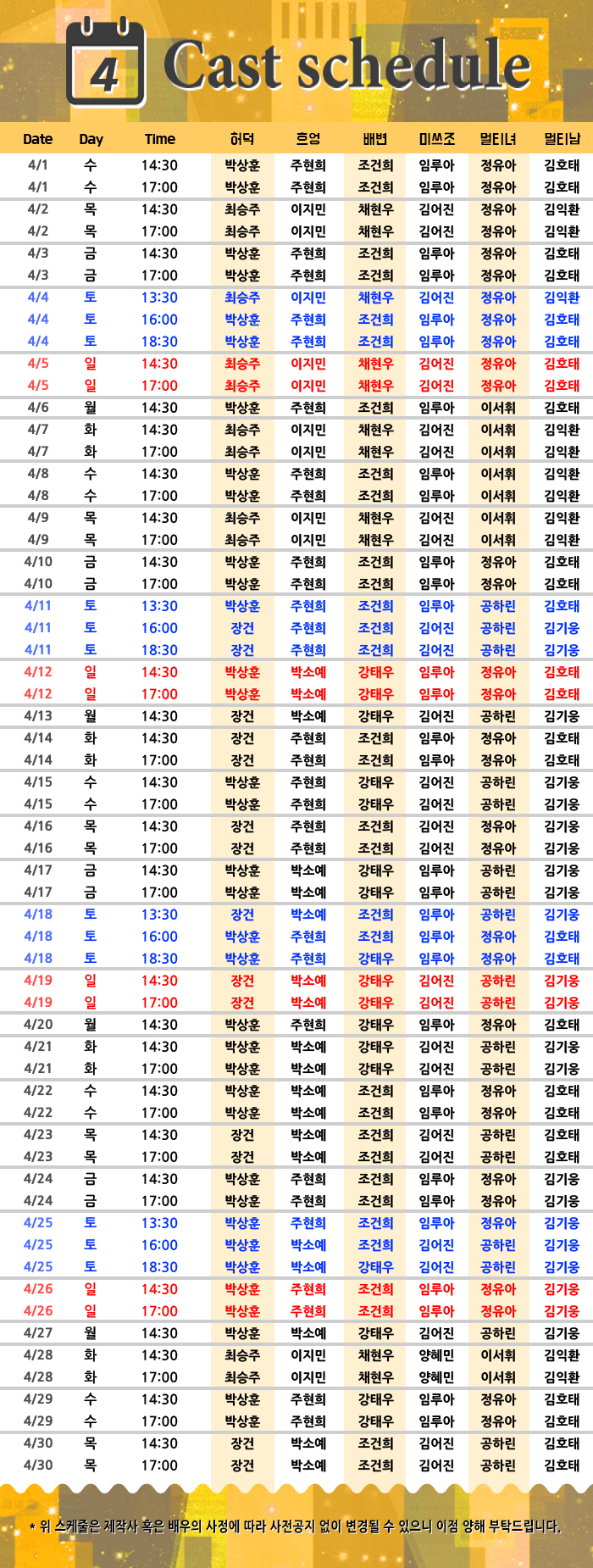 • 월 오후 2시30분 / 화, 수, 목, 금 2시30분, 5시 / 토 1시30분, 4시, 6시30분 / 일 2시30분, 5시