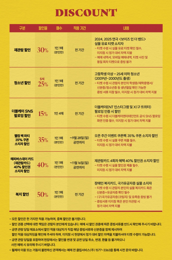 -할인에 따른 해당 증빙서류(신분증, 학생증, 재관람 티켓, 재관람 혜택 할인권, 복지카드, 유공자증 등)을 꼭 지참해주시기 바랍니다. 사본(사진, 캡처 등)으로는 할인 증빙이 불가하오니 실물로 지참하시길 바랍니다. 증빙자료 미지참 시, 현장에서 정가 대비 차액을 지불하셔야 합니다.