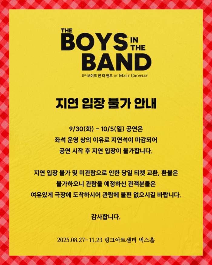 ※공연 시작 후에는 예매한 좌석으로 입장이 불가합니다. 지연 입장은 지정된 ‘지연 입장 시간’에 예매하신 좌석이 아닌 ‘지연 입장 석’에서 관람하게 됩니다. ‘지연 입장 시간’이 지나거나 ‘매진’으로 지연석 확보가 어려울 경우 관람이 불가할 수 있습니다. ‘매진’의 경우 별도의 안내가 없을 수 있는 점 참고 부탁드리며, 이로 인한 변경/취소/환불은 불가하니 공연 시작 전까지 입장하여 주시길 바랍니다.