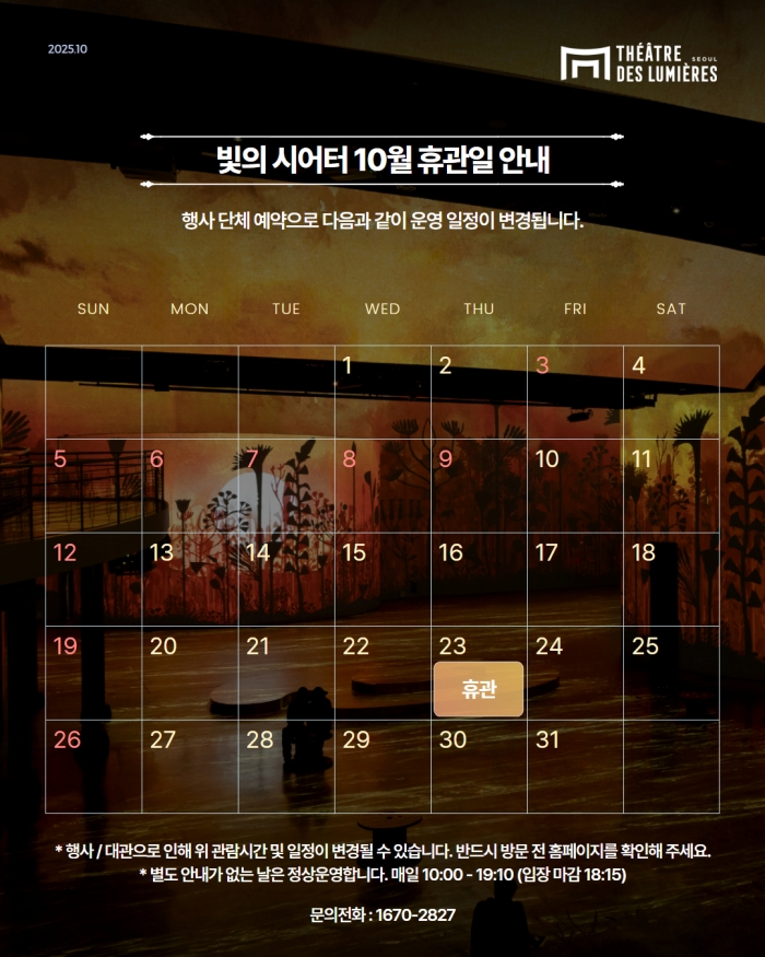 • 월~일 오전 10시 ~ 오후 7시10분 (입장마감 오후 6시15분)