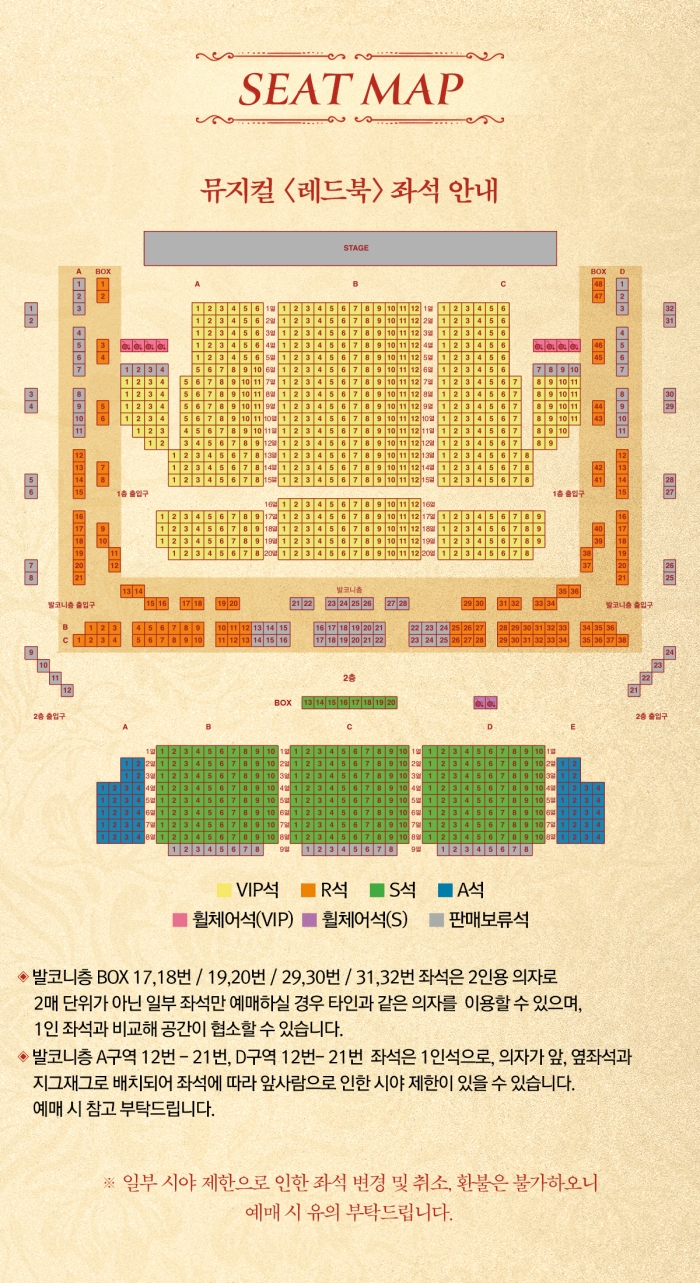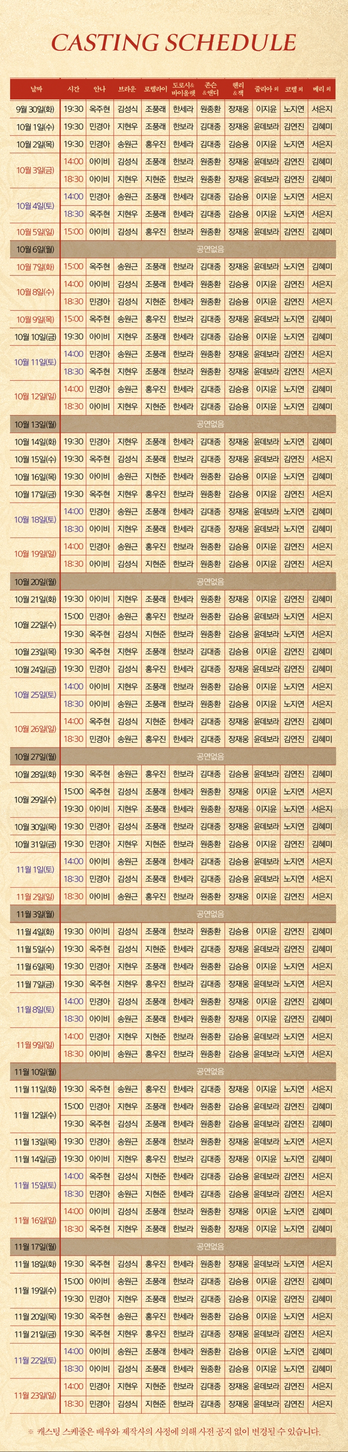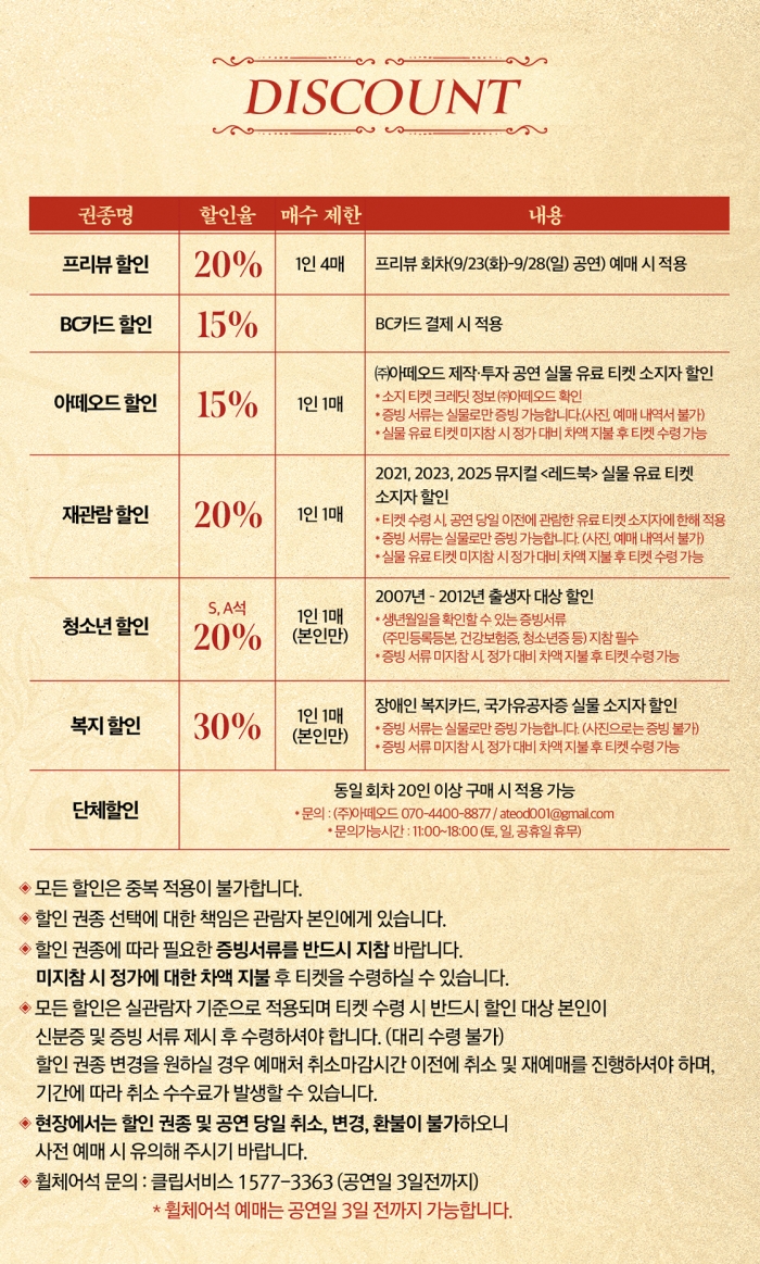 • 화, 목, 금 오후 7시30분 / 수 3시, 7시30분 / 주말, 공휴일 2시, 6시30분 (월 공연 없음)