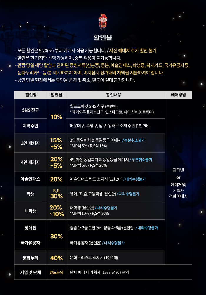 • 토 오후 2시, 6시 / 일 1시, 5시 / 수 7시30분 / 목 1시, 5시 (월, 화 공연없음)